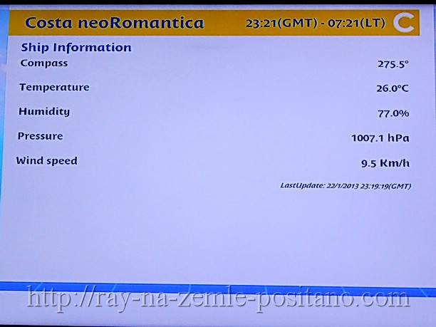 Кстати, на корабле мы проходим как итальянцы. И экскурсии берём на итальянском языке с итальянскими группами. Русских на корабле очень мало - мы видели всего одну пару с двумя детьми и для русских на корабле почти ничего нет. Есть одна девочка украинка в штате корабля. И это всё!